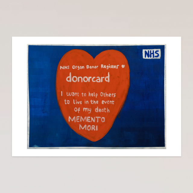 Based on the retro (orange background) and modern (blue background) organ donor card designs, these paintings are a reminder of the importance of organ donors in the lives of those in need of transplants and also to remind the viewer that we are all mortal beings.